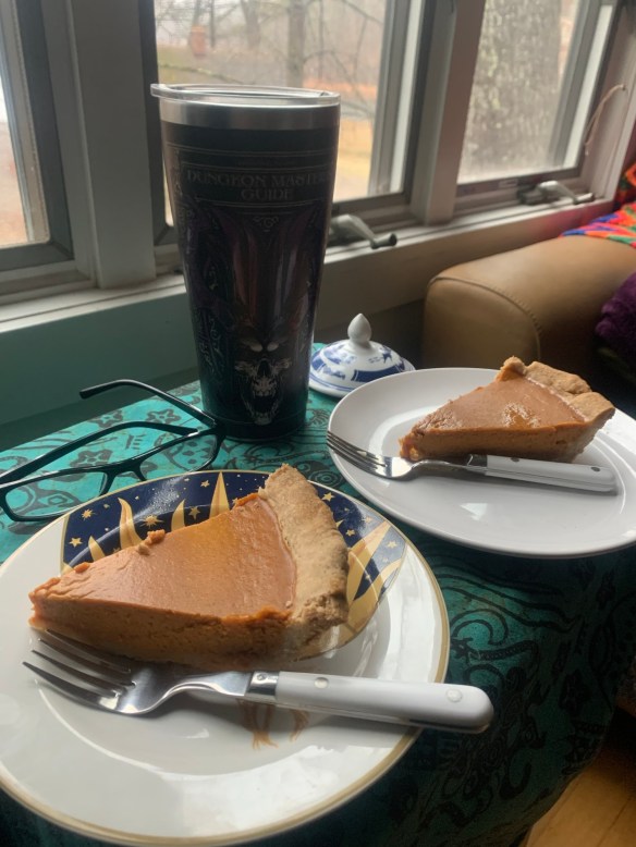 We ate the pumpkin pie we baked last night this morning with our hot coffee. After which we traveled to Bones, where I received a haircut from a dragon named Mike, while Tim the Enchanter wielded arcane fire as Monty Python and the Holy Grail played in the background.