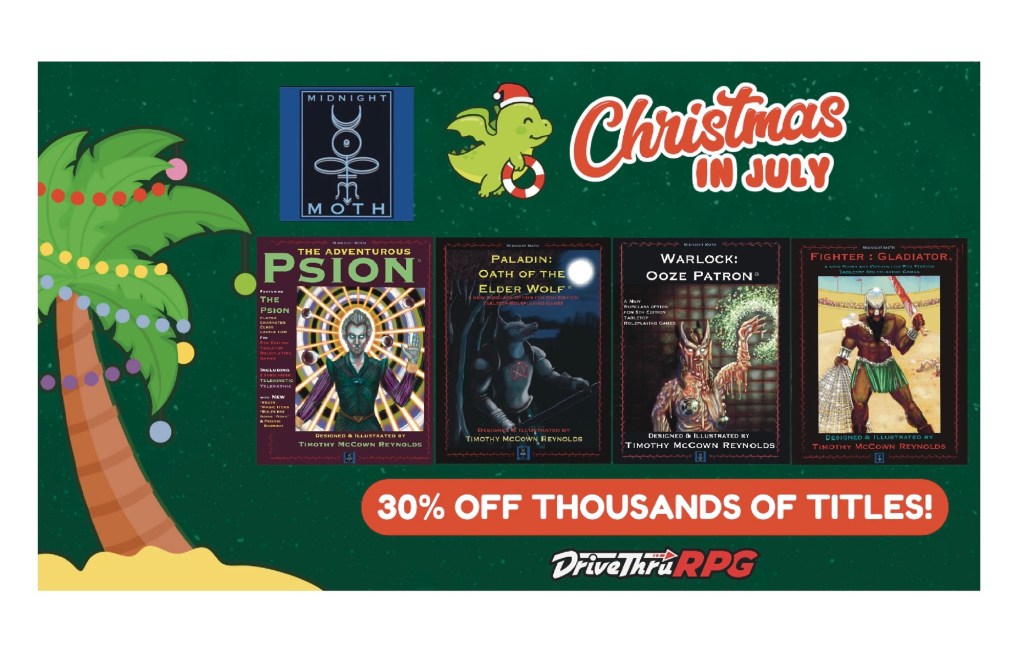 DriveThru RPG is having its annual curated Christmas in July sale, featuring Tabletop Roleplaying Game titles priced above $5.00 at a discount for a limited time, and The Adventurous Psion was selected to be part of their sale.