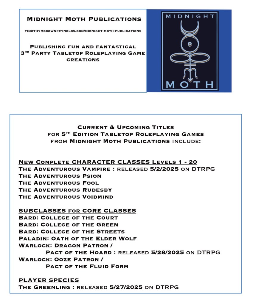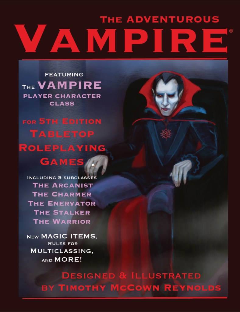 The Adventurous Vampire is your best resource for creating a Vampire player character for your 5th Edition Tabletop Roleplaying Game, with five subclasses to choose from, rules for multiclassing, more than 30 new magic items, blank character sheets, Vampire lore, and more.